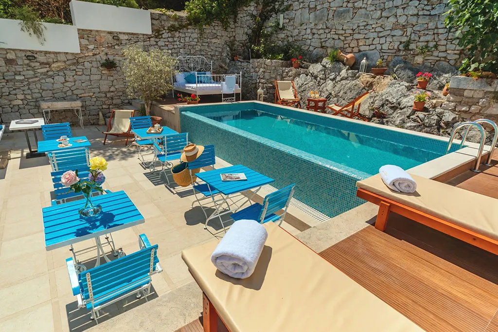 An intimate and authentic atmosphere, surrounded by stone and silence — featuring a hidden garden and pool, a private winery, and a unique charm.